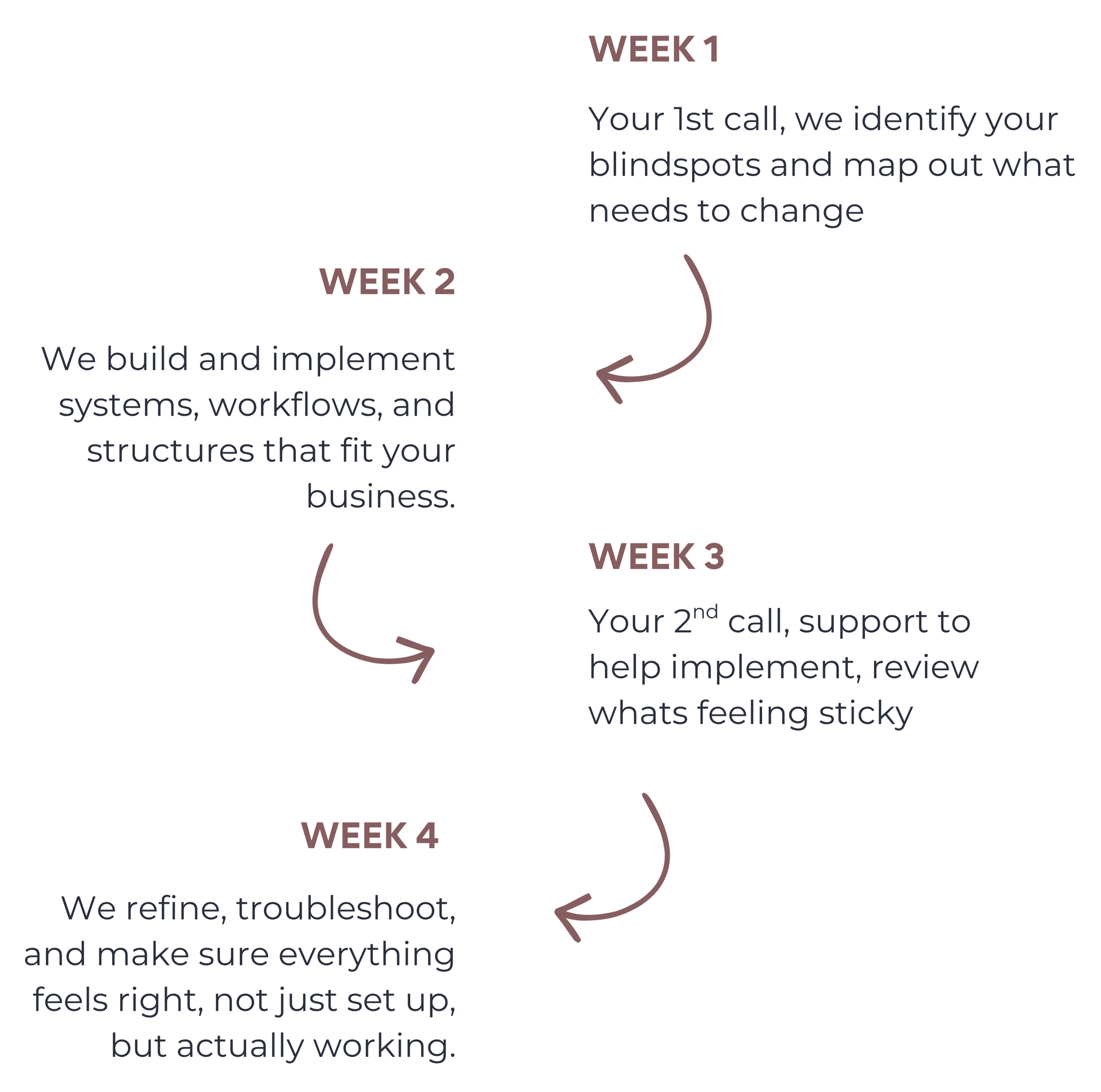 You've built a business that works… but it only works because you're holding it all together. In 4 weeks, let’s fix the backend so your business can run without needing more time, more hustle, or you having to remember everything.